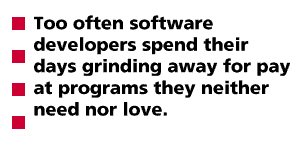 Perhaps this should have been obvious (it's long been proverbial that "Necessity is the mother of invention") but too often software developers spend their days grinding away for pay at programs they neither need nor love. But not in the Linux world - which may explain why the average quality of software originated in the Linux community is so high.