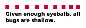 My original formulation was that every problem "will be transparent to somebody". Linus demurred that the person who understands and fixes the problem is not necessarily or even usually the person who first characterizes it. "Somebody finds the problem", he says, "and somebody else understands it. And I'll go on record as saying that finding it is the bigger challenge." But the point is that both things tend to happen quickly.