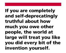 Andrew Tanenbaum had the original idea to build a simple native Unix for the 386, for use as a teaching tool. Linus Torvalds pushed the Minix concept further than Andrew probably thought it could go - and it grew into something wonderful. In the same way (though on a smaller scale), I took some ideas by Carl Harris and Harry Hochheiser and pushed them hard. We were not 'original' in the romantic way people think is genius. But then, most science and engineering and software development isn't done by original genius, hacker mythology to the contrary.