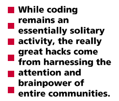 The history of Unix should have prepared us for what we're learning from Linux (and what I've verified experimentally on a smaller scale by deliberately copying Linus' methods). That is, that while coding remains an essentially solitary activity, the really great hacks come from harnessing the attention and brainpower of entire communities. The developer who uses only his or her own brain in a closed project is going to fall behind the developer who knows how to create an open, evolutionary context in which bug-spotting and improvements get done by hundreds of people.